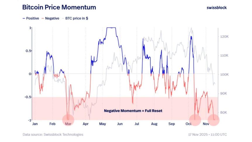An analysis chart illustrated that Bitcoin’s recent momentum declined to levels seen during its March bottom and after the October 10 market crash. Swissblock commented, “This is where bottoms build,” emphasizing that a strong recovery depends on reclaiming certain price levels. They stated: