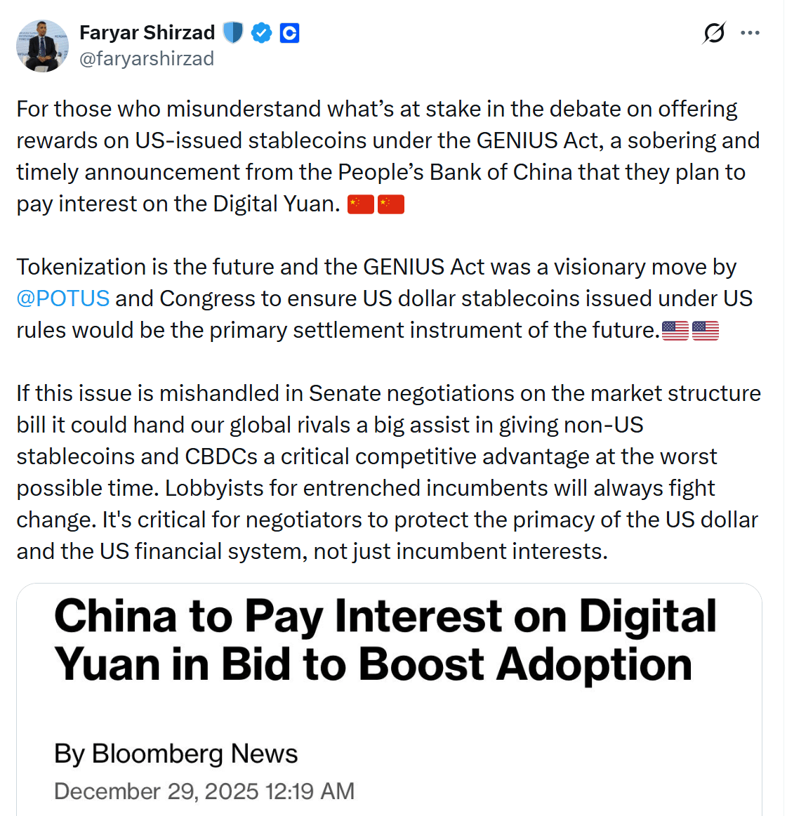 Faryar Shirzad, Coinbase’s chief policy officer, expressed concern via X about the implications of the GENIUS Act, which governs stablecoin issuance in the US. Specifically, he highlighted that restrictions preventing stablecoin platforms from offering rewards—linked to the law’s provisions—could hamper the global competitiveness of US dollar-pegged digital assets. Shirzad pointed out that China’s recent announcement indicating the introduction of interest payments on digital yuan wallets from January 2026 signals a swift move to extend the functionality of its CBDC beyond mere digital cash, integrating it deeply into banks' asset management and cross-border payment systems.