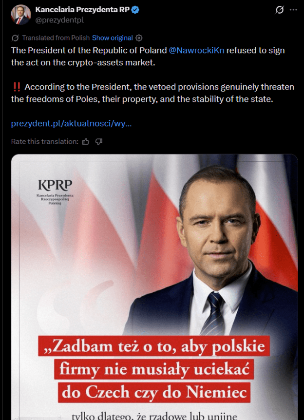 - Poland's crypto law, aligned with EU’s MiCA framework, was rejected after President Nawrocki vetoed it citing concerns over freedoms, property rights, and national stability.
