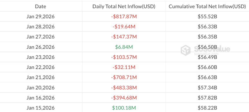 - Spot Bitcoin ETFs alone saw $817.9 million leave the market in a single session, the steepest daily withdrawal since late 2025, highlighting the fragility of near-term demand for physically backed BTC products.